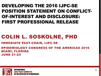The 24th annual international conference of the Global Ecological Integrity Group (GEIG) took place in Munich, Germany, July 4–8 2016, on the theme The Common Good: The Role of Integrity in the Support of Life and Human Security. Colin Soskolne presented SCOPING THE EXTENT OF THE PROBLEM OF CONFLICT-OF-INTEREST AND MONEYED INFLUENCE IN PUBLIC HEALTH. The presentation was placed in the session on Governance and the Protection of Human Rights. This presentation brings together components of the presentations that Colin Soskolne and Kathleen Ruff had delivered at the Special Symposium of the International Joint Policy Committee of the Societies of Epidemiology (IJPC-SE) as part of the 4th Epidemiology Congress of the Americas, Miami, Florida, June 21–24, 2016 (see here). [26 slides; 30 minutes plus 15 minutes for discussion]