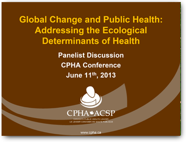 At the Canadian Public Health Association (CPHA) annual conference, Ottawa, Canada, June 9 – 12, 2013, a special symposium was held as part of the process for developing an updated position statement on global change and public health based on that developed by the CPHA in 1992. The symposium comprised a panelist discussion, under the theme Global Change and Public Health: Addressing the Ecological Determinants of Health. Preparation for this presentation was supported by the CPHA policy arm in which planning intern, Daniel Schwirtz, is acknowledged for coordinating much of the creative work for the presentation. [90 minutes; 59 slides: Soskolne responsible for slides numbered 34 – 41]