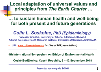 This presentation Local adaptation of universal values and principles from The Earth Charter to sustain human health and well-being for both present and future generations, was delivered remotely to the 4th International Symposium on Ethics of Environmental Health held in Ceské Budejovice, Czech Republic, September 9–12, 2018. [35 slides; 45 minutes]