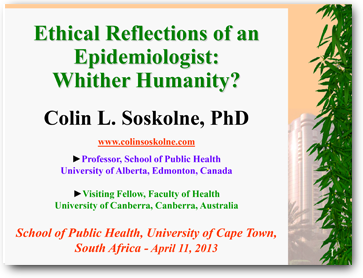 In South Africa, at the University of Cape Town's School of Public Health and Family Medicine Dr. Colin L. Soskolne, April 11, 2013, a Departmental Seminar entitled: Ethical Reflections of an Epidemiologist: Whither Humanity? [50 minutes + 15 minutes Q&A; 42 slides; n=35]