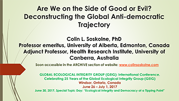 The paper Are We on the Side of Good or Evil? Deconstructing the Global Anti-democratic Trajectory was presented by Colin Soskolne on the Special Topic Day under the theme "Ecological Integrity and Democracy at a Tipping Point" at the Global Ecological Integrity Group (GEIG): International Conference held in Windsor, Ontario, Canada, June 26 – July 1, 2017. [19 slides; 20 minutes + 10 minutes discussion].