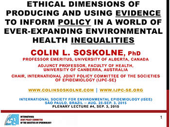 At the 27th Annual Conference of the International Society for Environmental Epidemiology (ISEE) on the theme of Addressing Environmental Health Inequalities, a 45-minute plenary lecture was delivered entitled Ethical Dimensions of Producing and Using Evidence to Inform Policy in a World of Ever-Expanding Environmental Health Inequalities. The conference took place in São Paulo, Brazil over the period August 30 – September 3, 2015. [76 slides; 45 minutes, followed by 15 minutes of discussion after a second plenary of 30 minutes]